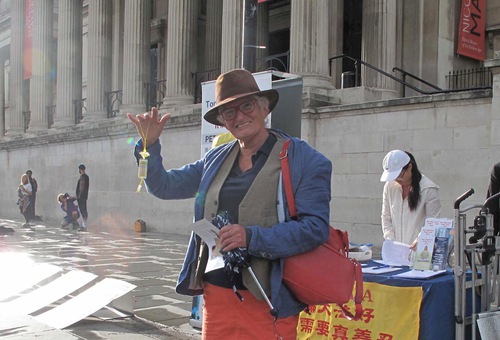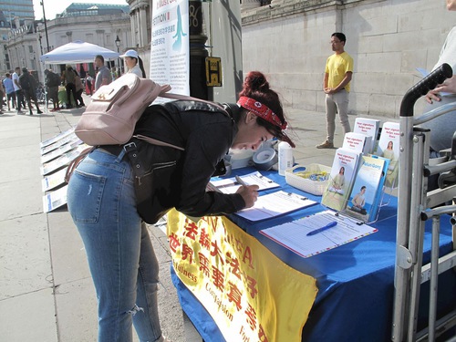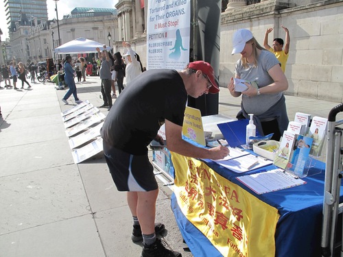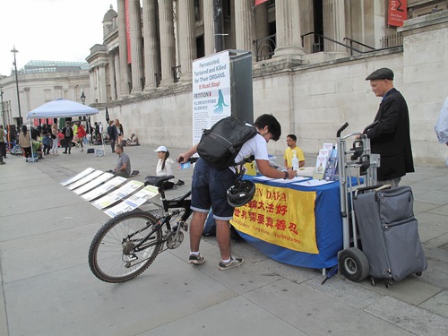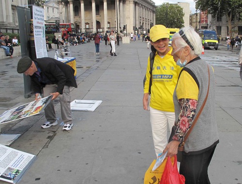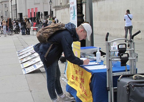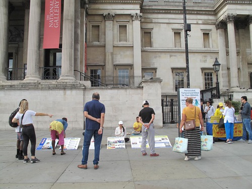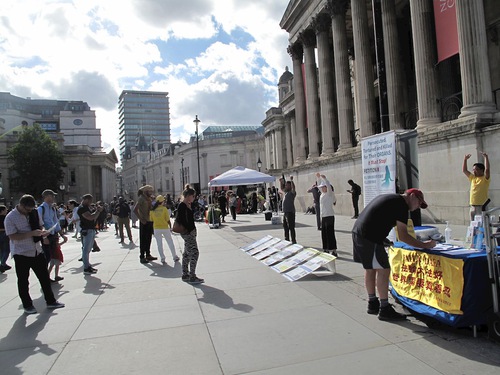 Практикующие Фалуньгун установили в северной части Трафальгарской площади информационную палатку. Прохожие, узнав о продолжающемся преследовании в Китае, подписывали петицию с призывом остановить эти злодеяния