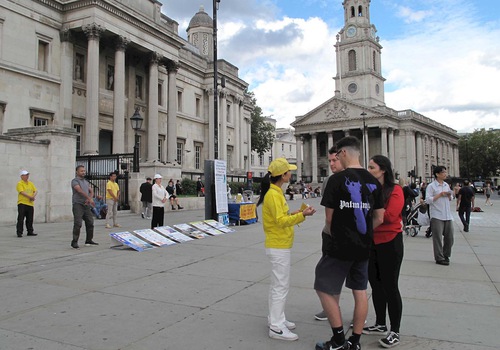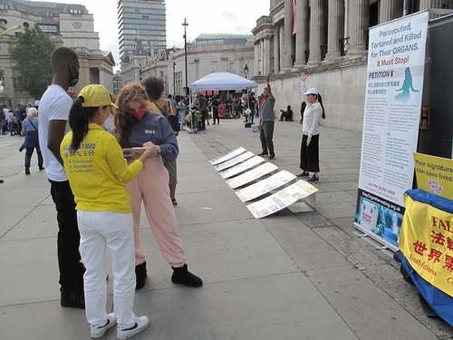 Поскольку правительство Великобритании продолжает ослаблять ограничения, введённые из-за эпидемии коронавируса, и прохожих на улицах стало больше, практикующие решили возобновить проведение мероприятий на Трафальгарской площади. Они разместили плакаты с надписями: «Фалунь Дафа несёт добро» и «Мир нуждается в Истине, Доброте, Терпении». Один из плакатов призывал людей подписать петицию против насильственного извлечения органов у практикующих Фалуньгун в Китае, а размещённая на шести стендах информация позволяла людям больше узнать о практике Фалунь Дафа.