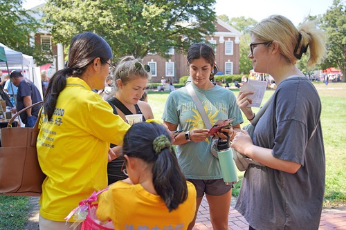 Практикующие рассказывают гостям Дня сообщества в Делавэрском университете о Фалунь Дафа и преследовании последователей этой духовной практики в Китае, 18 сентября 2022 года