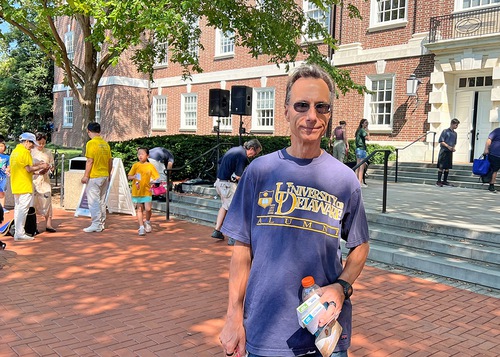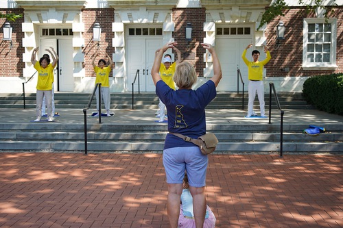 Кэн, выпускник Делавэрского университета, наблюдал, как практикующие Фалунь Дафа выполняют упражнения, а затем сказал: «Это может помочь снять стресс»