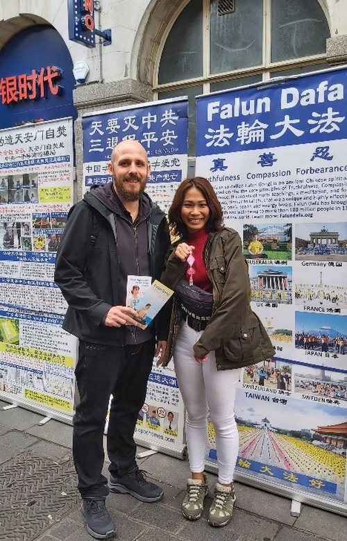 Практикующие Фалунь Дафа также регулярно проводят подобные мероприятия в Чайнатауне. Супружеская пара из США остановилась и немного поговорила с практикующими. Джеймс и его жена Джейми бежали из Китая 80 лет назад, а позже обосновались в Соединённых Штатах, став профессиональными медиками.