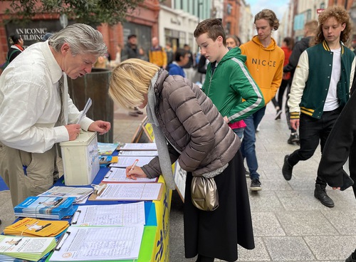 На мероприятии в Дублине прохожие подписывают петицию с призывом остановить преследование Фалунь Дафа в Китае