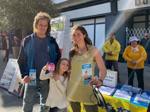 Супруги Эйден и Ребекка привезли дочь в центр города, чтобы купить ей подарок на день рождения. Они заметили рекламные стенды и остановились их почитать. Супруги сказали, что раньше не слышали о Фалунь Дафа. Поговорив с практикующими Фалуньгун, они узнали, что компартия Китая лишила свободы бесчисленное множество граждан. В местах заключения их пытают, и у них даже извлекают органы для продажи. Компартия преследует практикующих Дафа только за их желание следовать «Истине, Доброте и Терпению». Супруги немедленно подписали петицию, которая призывает остановить насильственное извлечения органов в Китае.
