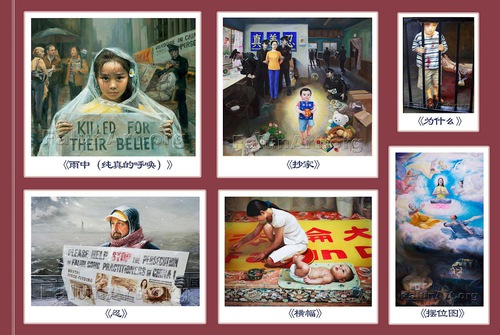 На картине «Почему?» (первый ряд справа) изображены узница совести с сыном в тюремной камере. Её израненные ноги в оковах дают людям понять очень глубокий и трагичный смысл картины. Выражение лица мальчика и его поза трогают зрителей до слёз. Все детали этого изображения подчеркивают жестокость компартии Китая (КПК) к практикующим Фалунь Дафа.